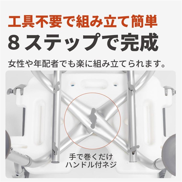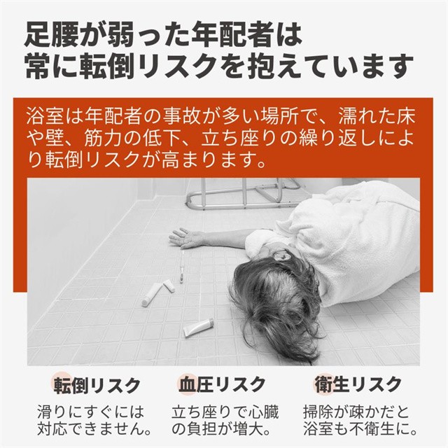 浴室は滑りやすく転倒のリスクが高まる場所です。特に年配者は、筋力の低下や立ち座りの動作が原因でリスクが増加します。このシャワーチェアは、転倒や滑りを防ぐための設計を取り入れており、安全にお風呂を楽しむことができます。