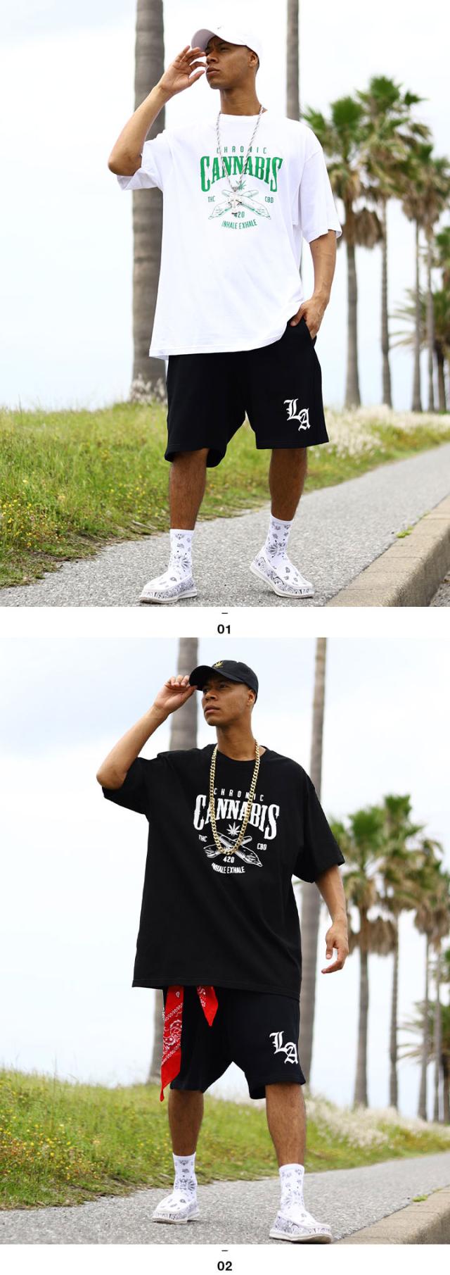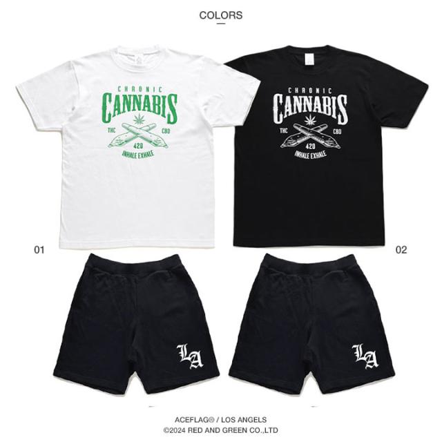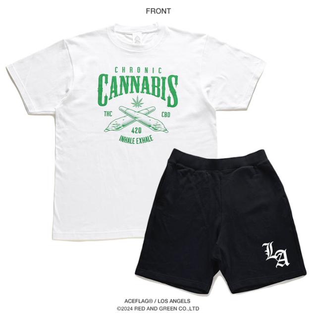 ヘンプに関するワードやモチーフをドロップしたTシャツと「Los Angeles」の頭文字にあたる「LA」をワンポイントでドロップしたスウェットハーフパンツの上下セット。
