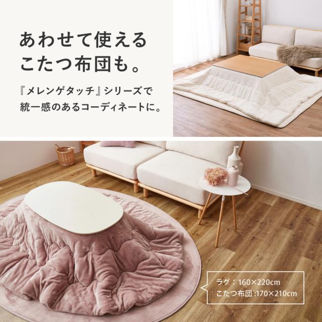 おもわず触れたなるような、メレンゲみたいなふんわりなめらかタッチラグ。薄手でやわらかく、折りたたんで収納もコンパクトに。軽量でお掃除や模様替えなどでの移動もらくらく!毛足が短めでゴミが入り込みにくくお手入れも簡単、汚れても洗濯できるからいつもきれいで衛生的に、安心してお使いいただけます。丸に近いやわらかなフォルムでやさしい雰囲気のインテリアに。長方形・楕円形・円形のテーブルにも合わせやすい楕円形のラグです。