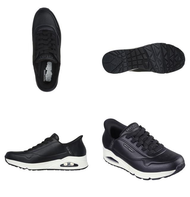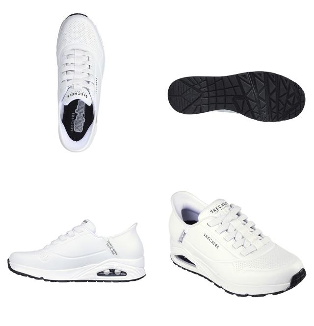 アイコニックな人気アイテムをさらに快適で履きやすくアレンジしたSkechers Street(スケッチャーズ ストリート) Hands Free Slip-ins(ハンズフリー スリップインズ): ウノ - イージー エア。独自のHeel Pillow(ヒールピロー)デザインを採用したファッションスニーカー。ストレッチレースを配した人工皮革のアッパー、クッション性のあるSkechers Air-Cooled Memory Foam(スケッチャーズ エアクールドメモリーフォーム)インソール、ビジブル構造のSkech-Air(スケッチエア)エアバッグミッドソールが特長です。