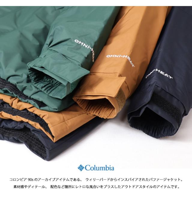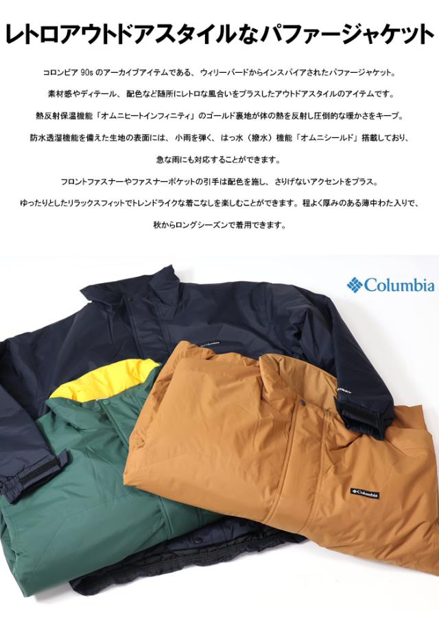 コロンビア90sのアーカイブアイテムである、ウィリーバードからインスパイアされたパファージャケット。 素材感やディテール、配色など随所にレトロな風合いをプラスしたアウトドアスタイルのアイテムです。熱反射保温機能「オムニヒートインフィニティ」のゴールド裏地が体の熱を反射し圧倒的な暖かさをキープ。防水透湿機能を備えた生地の表面には、小雨を弾く、はっ水(撥水)機能「オムニシールド」搭載しており、急な雨にも対応することができます。 フロントファスナーやファスナーポケットの引手は配色を施し、さりげないアクセントをプラス。ゆったりとしたリラックスフィットでトレンドライクな着こなしを楽しむことができます。 程よく厚みのある薄中わた入りで、秋からロングシーズンで着用できます。
