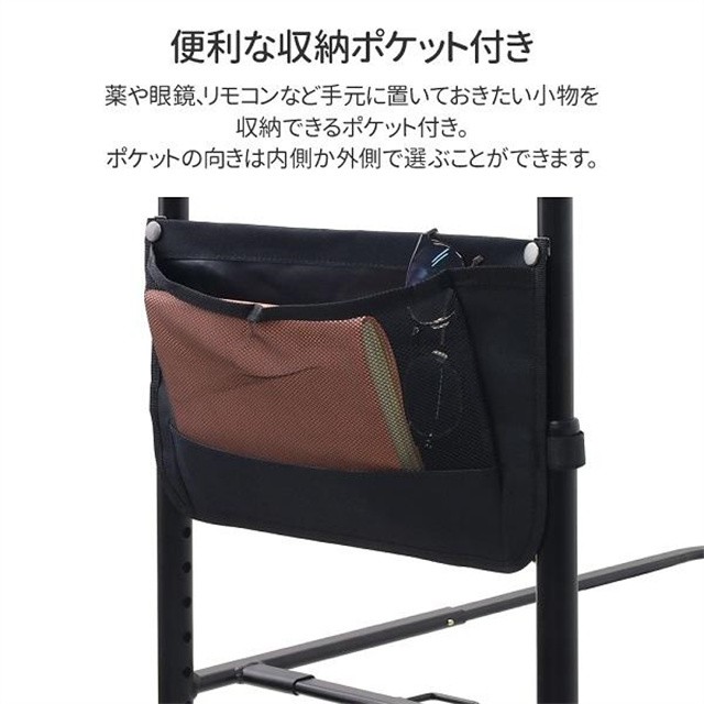 薬や眼鏡、リモコンなど手元に置いておきたい小物を収納できるポケット付き。