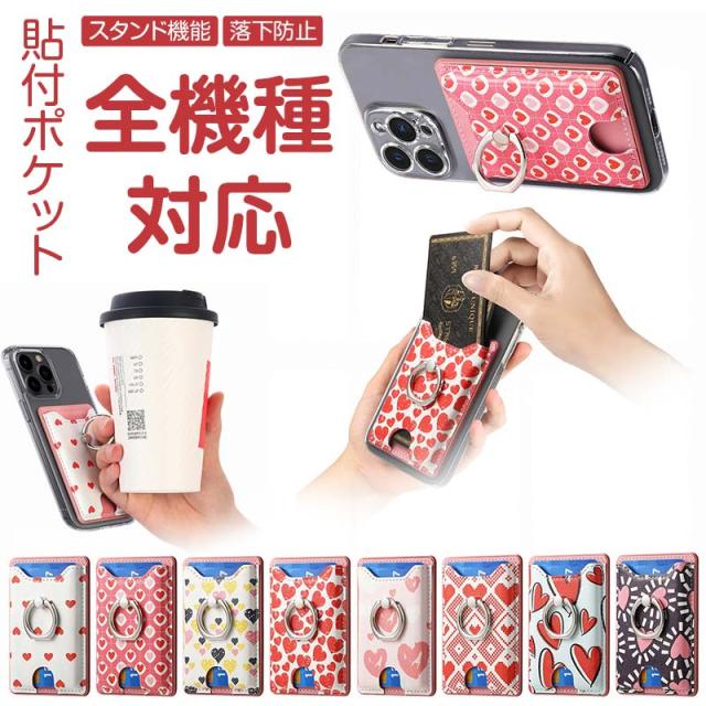 スマホカードケース リング 落下防止 スタンド ハート柄 ハート カード収納 背面ポケット 貼り付け カードポケット 貼る スマホカードケース貼り付け スマホポケット カード スマホカードケース アクセサリー スマホアクセ icカード 収納ポケット