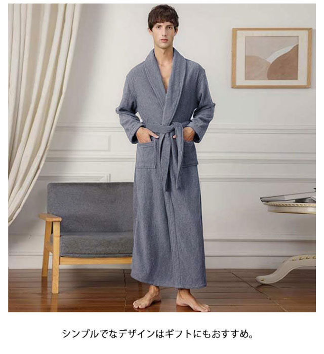 | お風呂上りにさっと羽織れる便利なバスローブの登場です。【マキシ丈】【男女兼用】 コットン100%の柔らかなタオル生地を使用しました。柔らかなバスタオルに包まれているようなふわふわな肌触り。 お風呂上がりやラウンジウェアとしてラグジュアリーなひと時を過ごせる端正な1枚に仕上げました。 まるで綿花を纏うような肌心地を、あなたの素肌で実感してください。 シンプルでなデザインはギフトにもおすすめ。 ユニセックスデザインなので男女ペアで着用できます。 | |