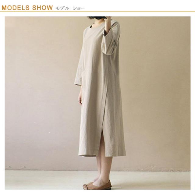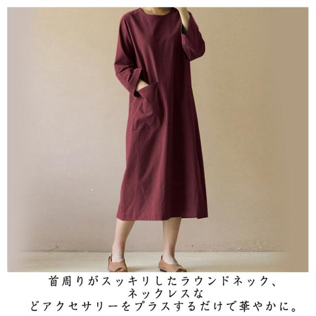通気性 クルーネック ワンピース 長袖ワンピ 長袖 膝下 ワンピース ビッグサイズ ロングワンピース 森ガール ミモレワンピース 体型カバー 綿麻調 ナチュラル 吸湿性 快適 薄手 春 秋 服 物 おしゃれ