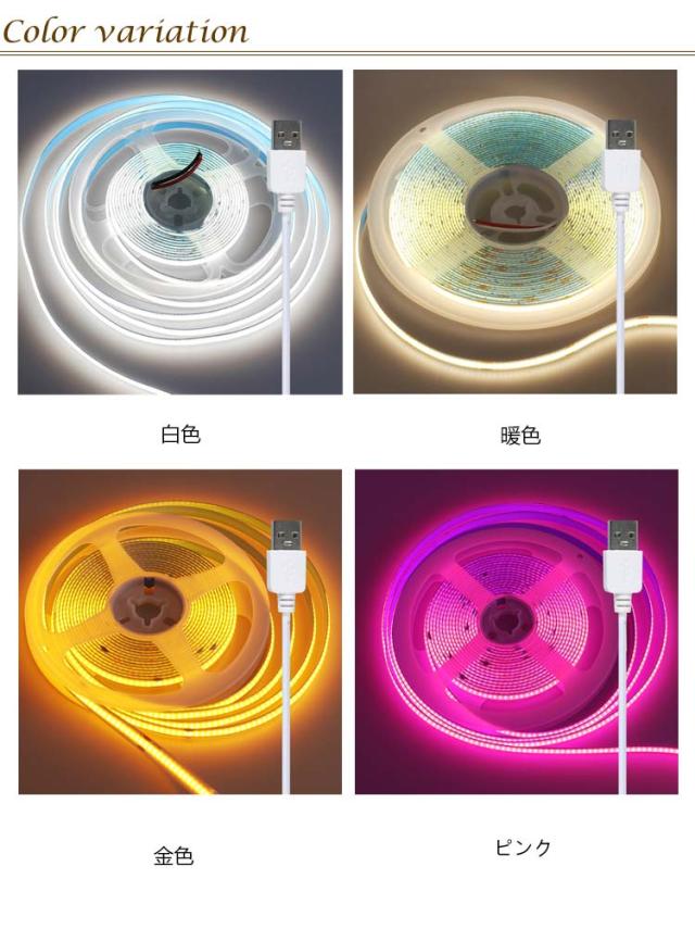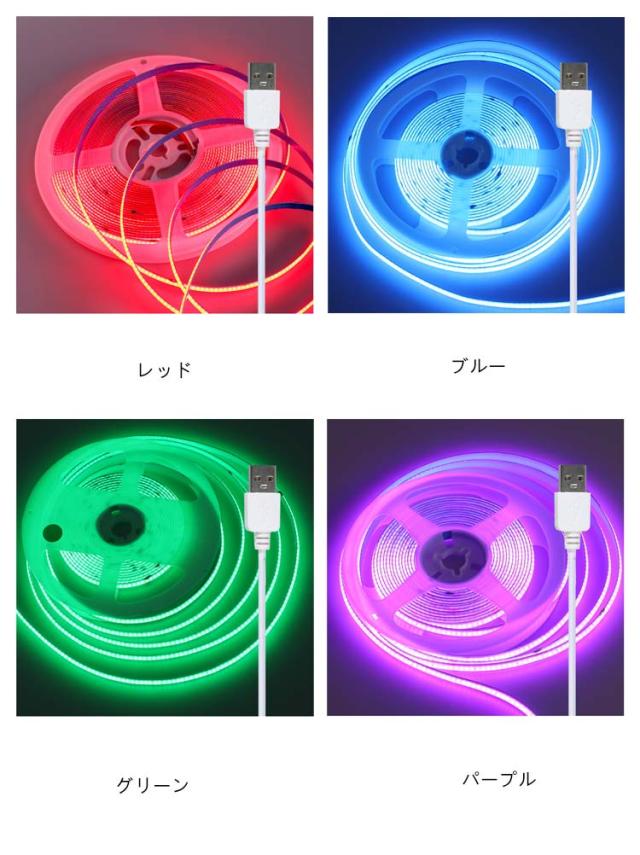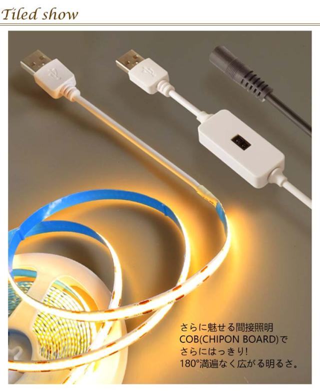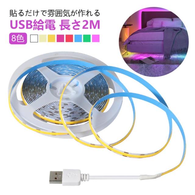テープライト USB 2m LED 間接照明 ledテープライト cob 室内 屋外 照明 イルミネーション ライト 電球色 昼光色 防水 スイッチ 粘着テープ 5v 低圧 安全 棚下照明 切断可能 高輝度 全面発光 クリスマス 装飾 寝室 店舗 玄関 足元灯 部屋 DIY