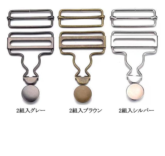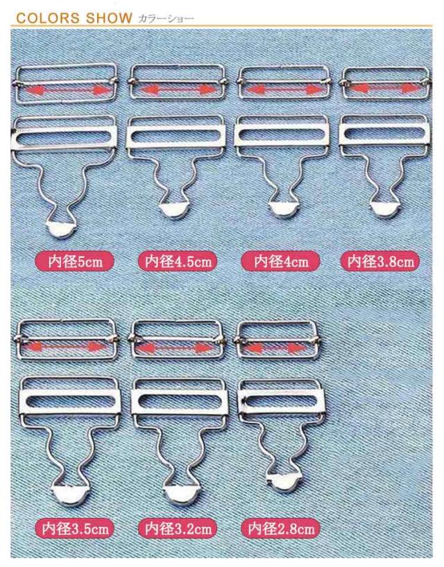 | 2組入!内幅2.8cm/3.2cm/3.5cm/3.8cm/4cm/4.5cm/5cm オーバーオールやサロペットなどの肩ひも調節にお使いいただける、 タックボタンと移動カンがセットになった吊りカン | |