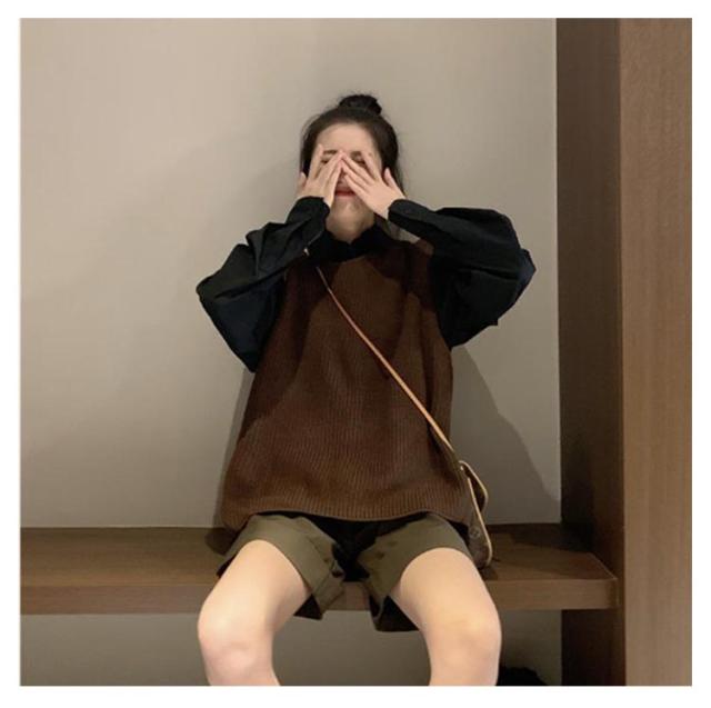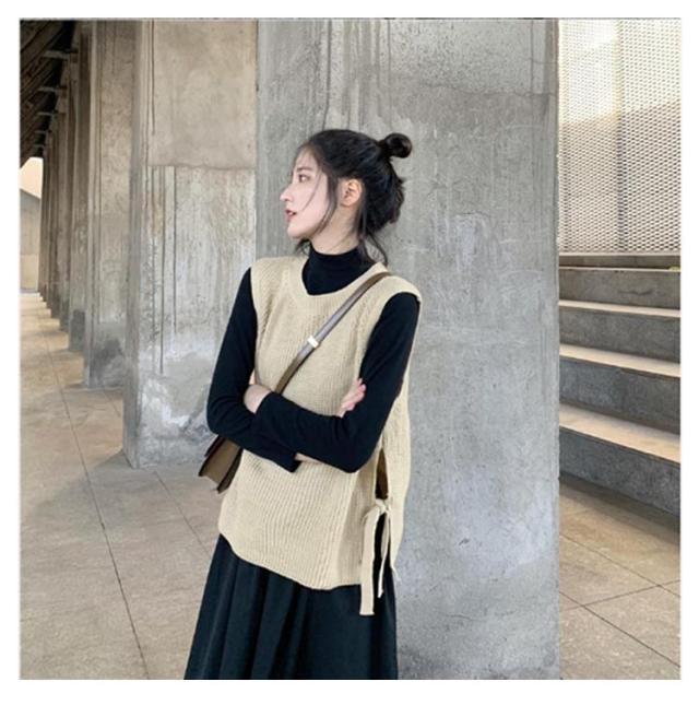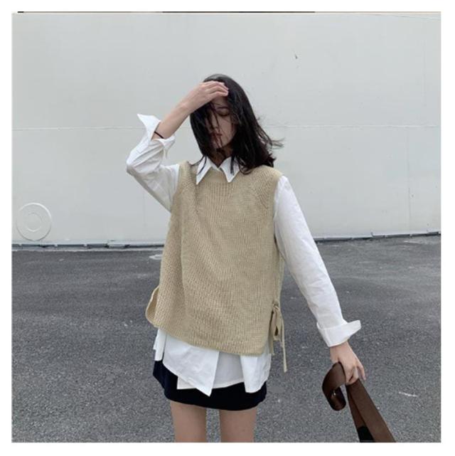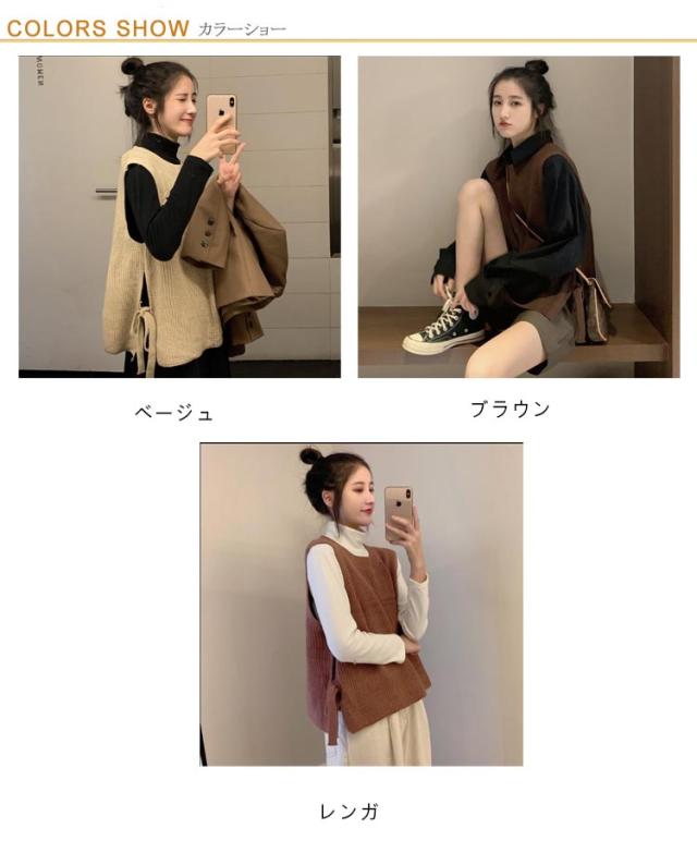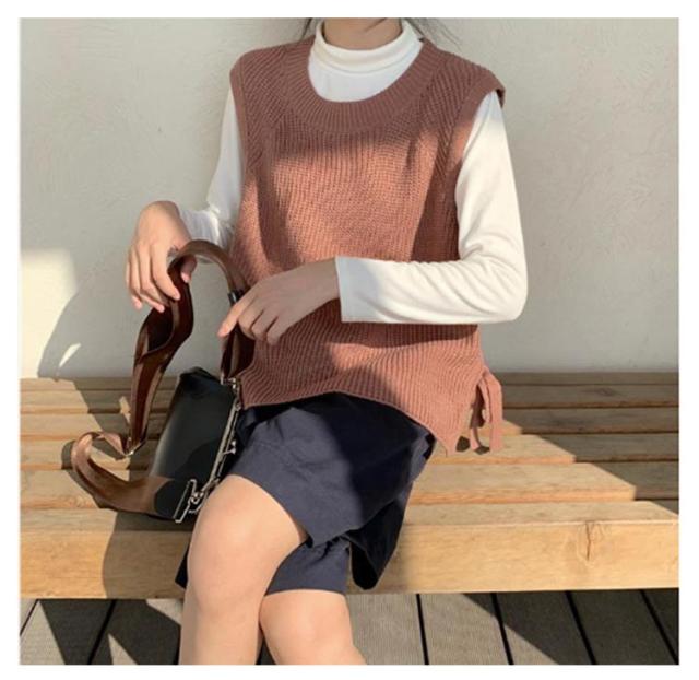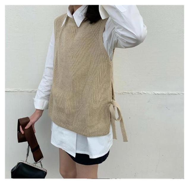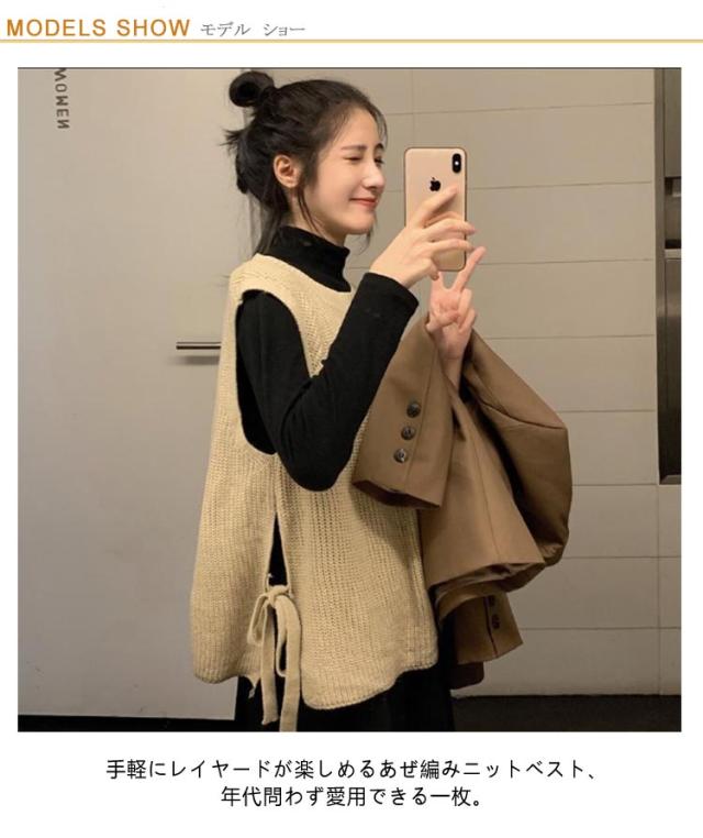 プルオーバー ニットベスト サイドリボン ベスト あぜ編み サイドリボン クルーネック ベスト レディース ニット ジレ 丸首 重ね着 スリット 秋冬 ニットベスト ショート丈 ノースリーブ セーター 送料無料