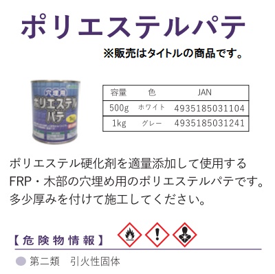 ○ポリエステル硬化剤を適量添加して使用するFRP・木部の穴埋め用のポリエステルパテです。多少厚みを付けて施工してください。