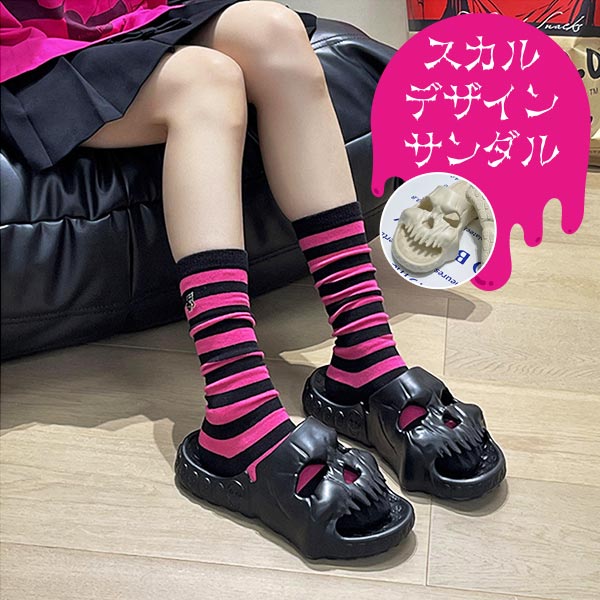送料無料 5サイズ 2カラー スカル サンダル 防滑 グリップ性 ソール フロント 屋内 屋外 履物 ストリート 骸骨 髑髏 ドクロ スリッパ