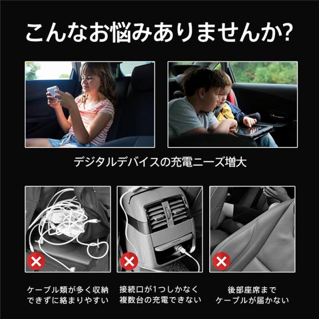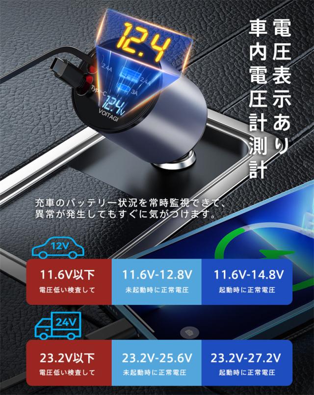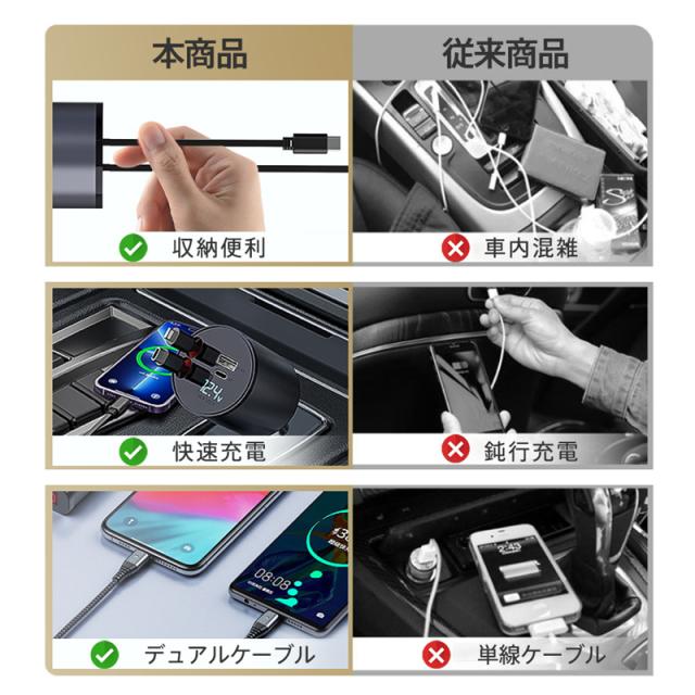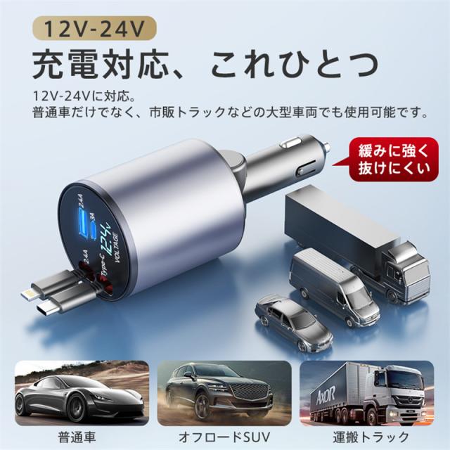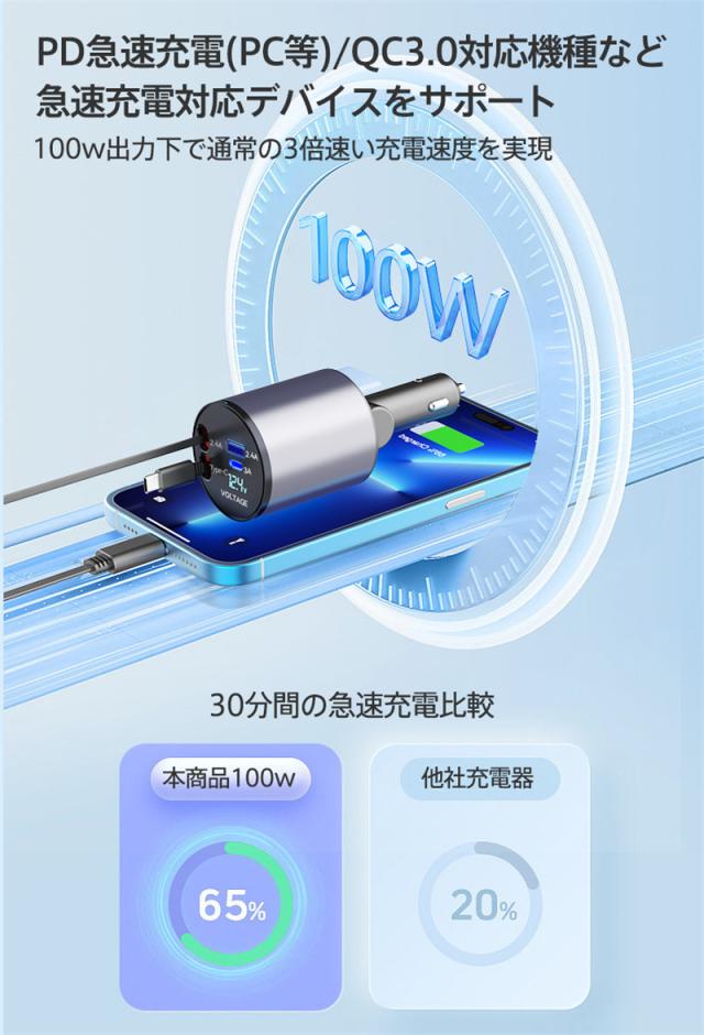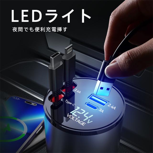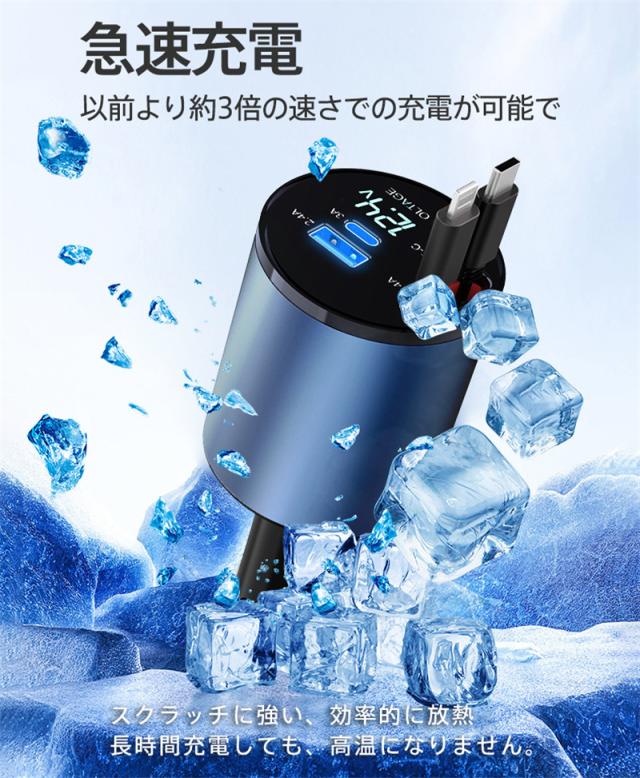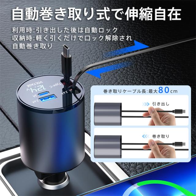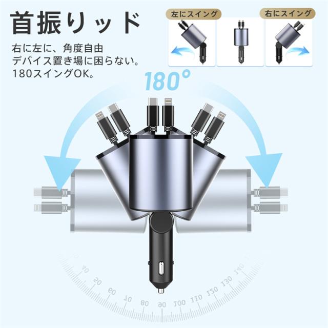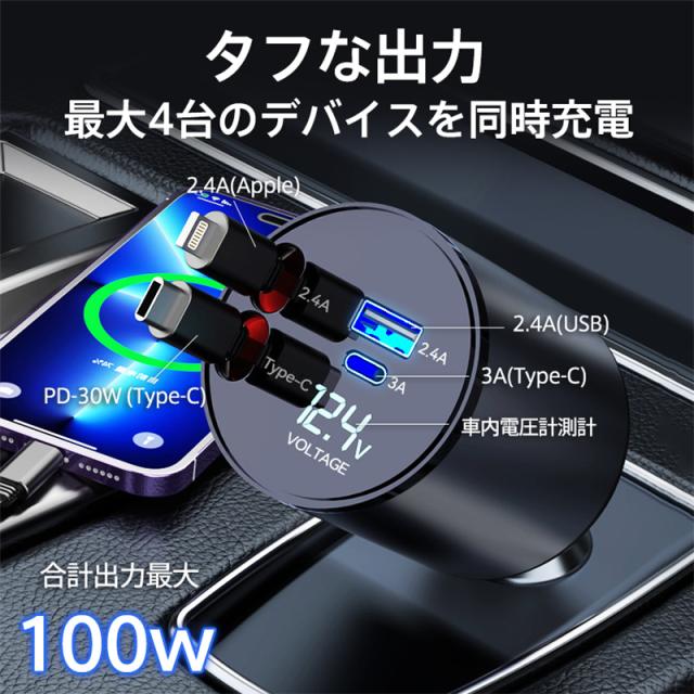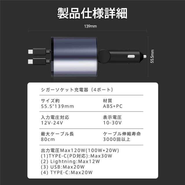 シガーソケット 充電器 4ポート 車載充電 リール式 巻き取り 急速充電 快速 高速 カーチャージャー シガーチャージャー 伸縮ケ