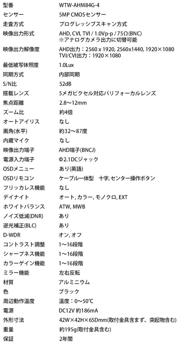 WTW-AHM84G-4は、国内の大手防犯カメラメーカー塚本無線社製の、有効500万画素小型カメラです。