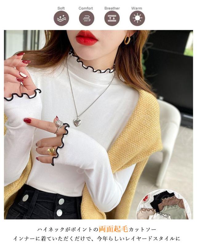 キーワード:ハイネックカットソー トップス レディース 長袖 ハイネック インナー 微起毛 春秋冬 重ね着 コーデ インナー 着こなせ きれいめ カジュアル 可愛い 無地 白 ホワイト 黒 ブラック tシャツ プルオーバー ストレッチ 着痩せ 着心地いい 肌触りいい おしゃれ 送料無料