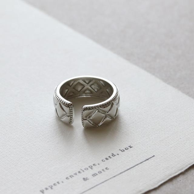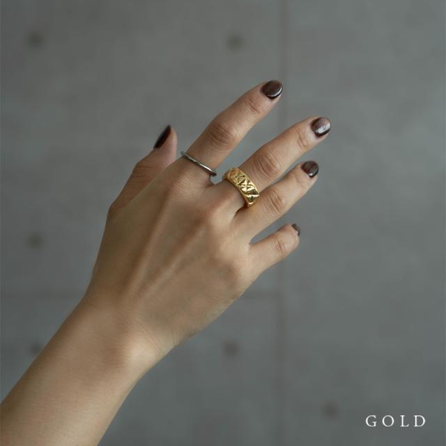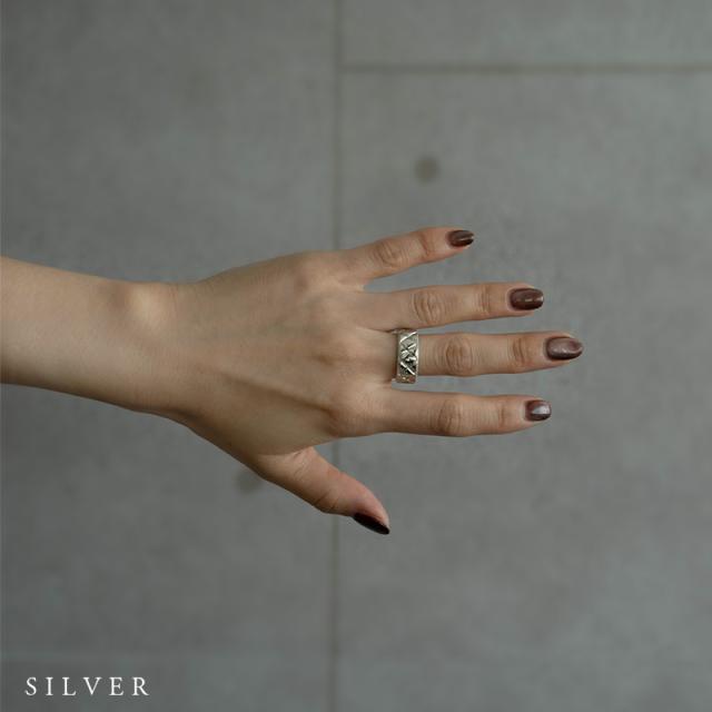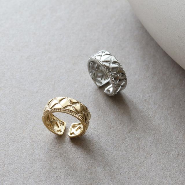 | ぷっくりとしたキルティングのような格子状の加工を施したリングです。 手元にアクセントを与えてくれるサイズ感で、メタルの艶感が映えます。 華奢なリングとの重ね着けもおすすめです! | |
