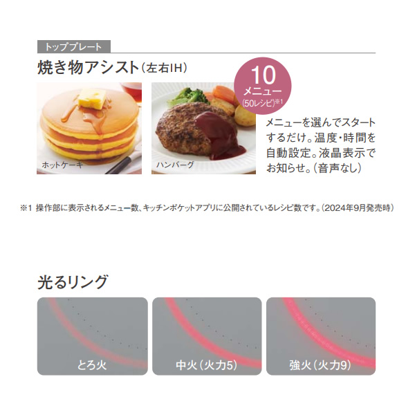 表示10メニューから選んで設定し、調理が可能に。メニューを選択すると、温度・時間をIHが自動設定、裏返すタイミングなどを液晶表示と音声でお知らせ。