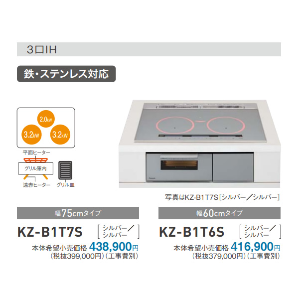 ビルトインIHクッキングヒーター Panasonic パナソニック KZ-B1T6S Bシリーズ 幅60cm 3口IH 鉄・ステンレス対応 シルバー