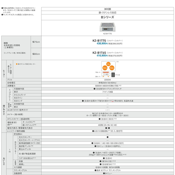 ビルトインタイプ Bシリーズ 3口IH 鉄・ステンレス対応(左右、後ろ3つのIHすべて鉄・ステンレスのフライパン・鍋のみ使用できます。) ■設置タイプ:ビルトイン ■口数:3口 ■トッププレート幅:60cm ■定格電圧:単相200V(50-60Hz) ■総消費電力:5800W/4800W(切替式) ■最大消費電力 左右IHヒーター:3200W 後ろIHヒーター:2000W グリル:2200W ■ヒーター仕様:3口IH 鉄・ステンレス対応 ■トッププレート色:シルバー ■本体正面色:シルバー ■寸法:幅598mm×奥行き574mm×230mm ■質量:23.0kg ※記載は商品仕様の一部です。仕様説明不足等の理由での返品はできません。特に適合等は必ずご確認ください。