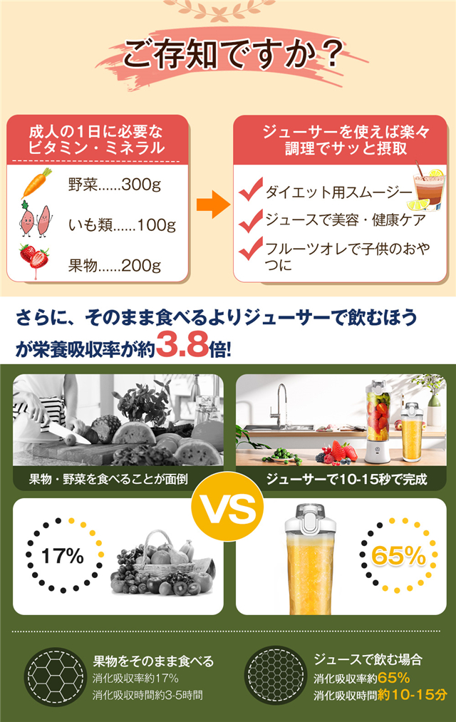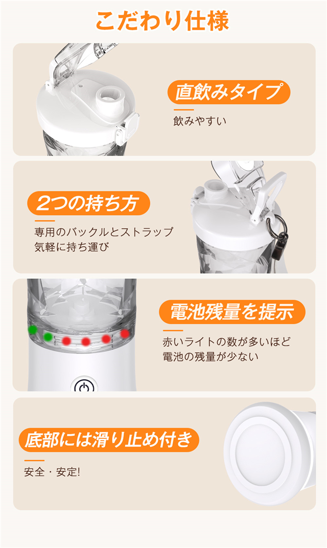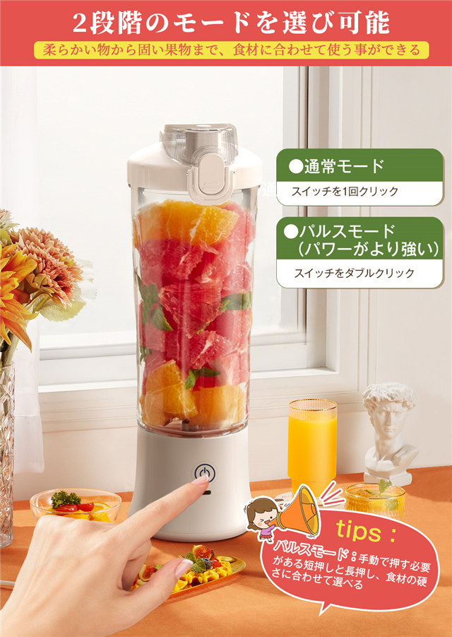 ・使い方は簡単、ボタンを押すだけで、鋭い切れ味と耐久性の高い立体的なステンレス製6枚刃で、30秒ぐらいで滑らかで細かな口当たりができるジュース・スムージーが出来上がります。
