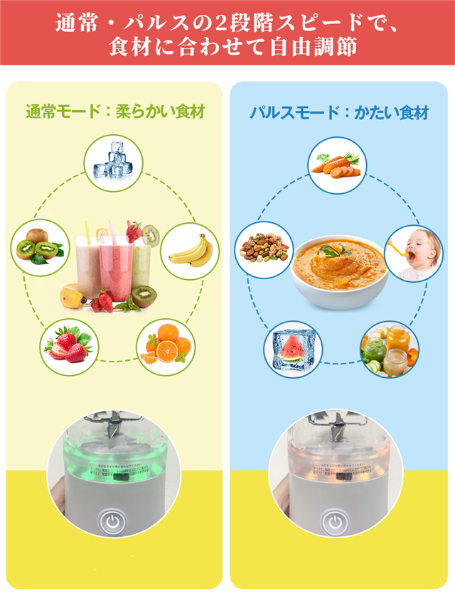 ・市販の通常モードよりも強力なパルスモードを新たに開発した、氷や硬い食材に適しています。