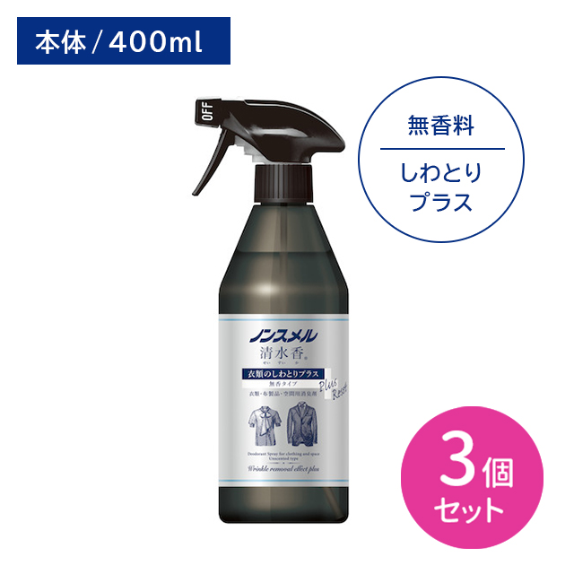 【北海道も送料0円!追加送料なし!】【3個セット】ノンスメル清水香 衣類のしわとりプラス 400ml 消臭 除菌 べたつかない 速乾 匂い ニオイ 皺 身だしなみ 整える 汗 体臭 タバコ 料理 ペット 衣類 布製品 空間 寝具 マット 白元アース