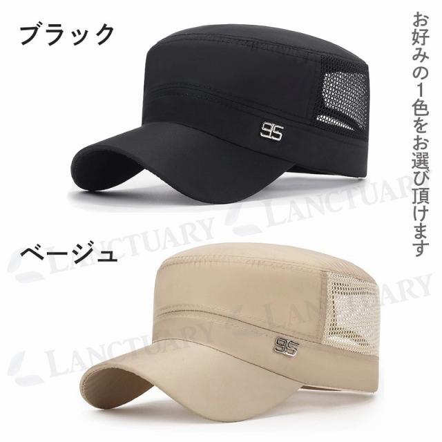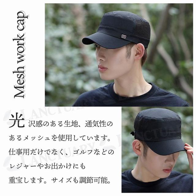 ワークキャップ 光沢生地 メンズ サイズ調節ベルト付き メッシュ ロゴ 仕事用 ゴルフ 山登り レジャー ブラック ベージュ かっこいい 無地 紫外線予防 agesugi_sfa