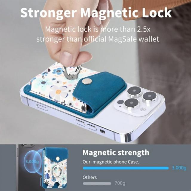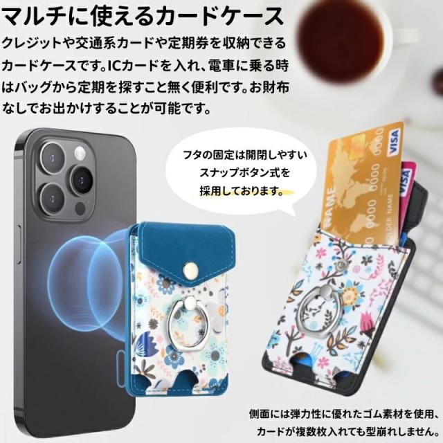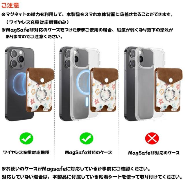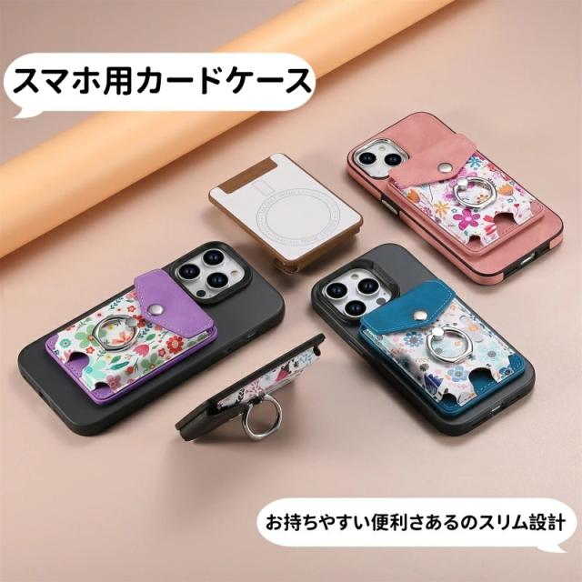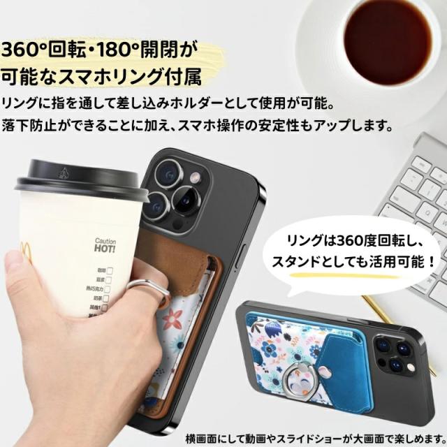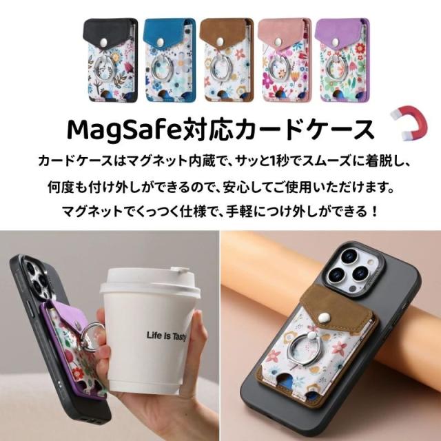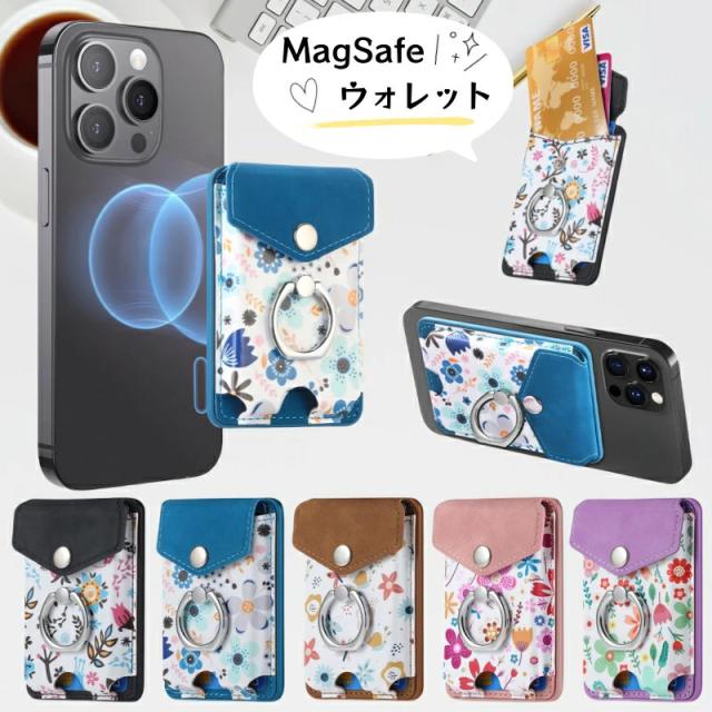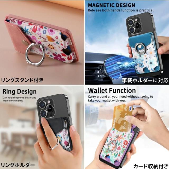 MagSafeウォレット MagSafeカードケース カードポケット iPhone 15 14 13 12 磁気ウォレット 花柄 おしゃれ リング付き 磁気ウォレット マグネット付き スマートカード スタンド機能 スマホリング 落下防止 便利 MagSafeアクセサリー ワイヤレス充電対応 取り外し可能