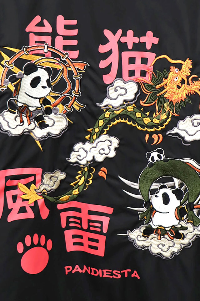 ポリエステルナイロンの表面には、熊猫風神雷神と昇龍を用いたオリエンタルデザインを刺繍とプリントで施した豪華仕様のミリタリージャケットになります。