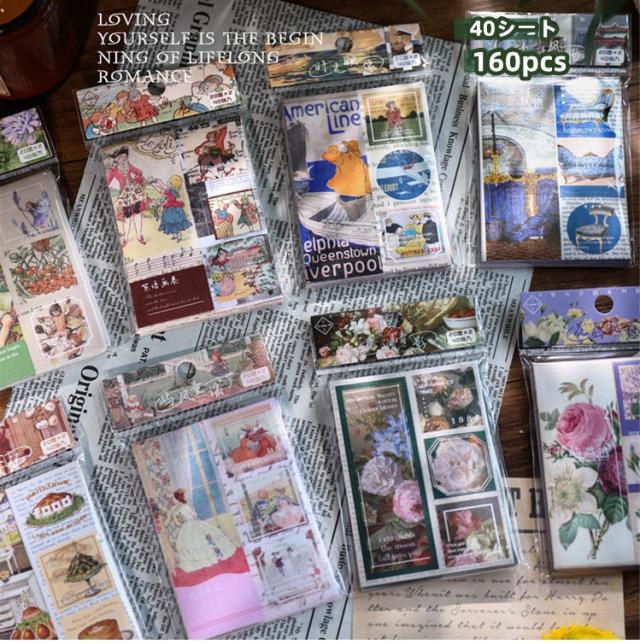 海外ステッカー 40シート 160pcs イラスト シールシート 型抜き 大容量 海外コラージュ素材セット コラージュ マステ クッキング ケーキ 花柄 アメリカン 生活 雑貨 家具 物語 窓掛け カーテン フレーム シール スクラップブッキング アンティーク レトロ 手帳 DIY