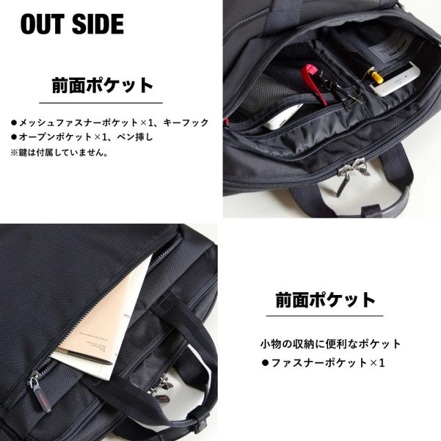 | ポケット | メインルーム: オープンポケット中(メッシュ)x2、PCポケット・タブレットポケット(クッション材入り) 前面ルーム: オープンポケット小(メッシュ)、ファスナーポケット中(メッシュ)、ペン挿し、キーハーネス 前面: フリーポケット 側面: サイドハンドル 背面:キャリーループ |
