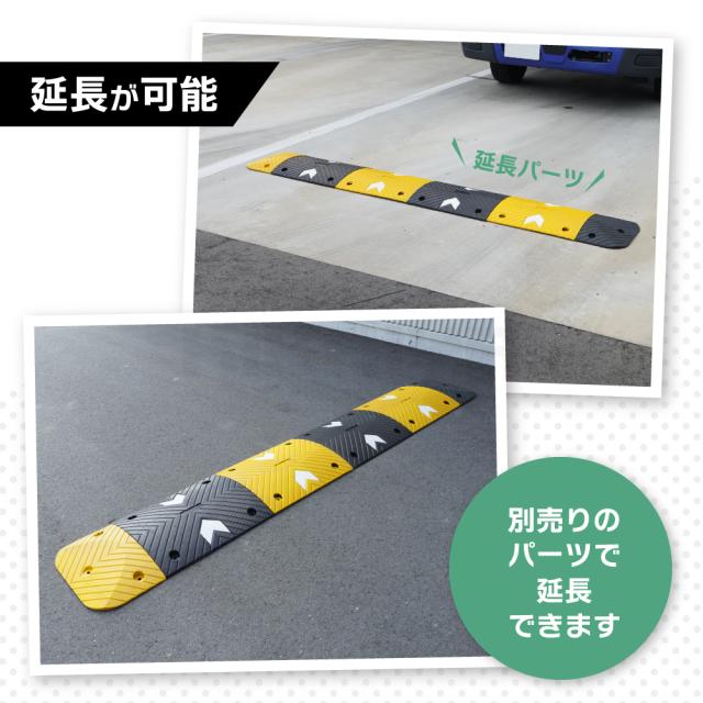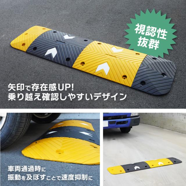 走行車の速度を抑制する減速帯 矢印デザインで存在感UP ●通過する車両に振動をあたえて、スピードを緩めさせることができます ●高さ約5cmと強めの衝撃タイプなので、一時停止の呼びかけに効果的 ●黄色と黒の2色カラーで視認性抜群!注意喚起を促します ●凹凸のある表面で、タイヤのスリップを防止 ●私道や駐車場、工事現場など、様々な場所に設置できます ●バラバラなので配置が簡単!別途延長パーツで長くすることもできます ●屋内でも屋外でも使用可能です ※固定する場合は、別途アンカーや接着剤が必要です ★延長パーツもございます 品番:SET-SPYB |