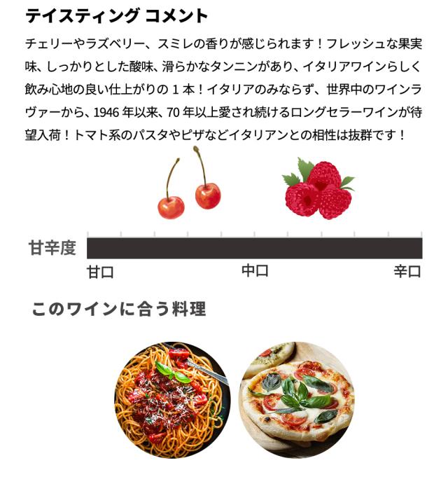 ![]() ■ぶどう品種:サン・ジョヴェーゼ、カベルネ・ソーヴィニョン、メルロー、シラー、プティ・ヴェルド ■土壌:肥沃土壌 ■標高:585m 大人気シリーズ! アンティノリはトスカーナ州に始まり、北のピエモンテ州から南はシチリア州に渡り、イタリア全土に10以上のワイナリーを所有!イタリア各地において、「その土地のスペシャリスト」とも言うべき、土地の個性をしっかりと表現をした素晴らしいワインを造り出しています!ずばり名門アンティノリの品質を気軽に楽しむことが出来る大人気シリーズ「サンタ・クリスティーナ」(その名を知らぬものはいないというほどイタリア国内で愛されるワイン)! 確かな造り手! ベストワインメーカーやベストワインプロデューサーなど、数えきれないほどの賞を獲得する26代目当主、ピエロ・アンティノリ侯爵と3人の愛娘が運営!創業当時から変わらぬ家族経営のスタイルを貫いています!そんなアンティノリはトスカーナ州に始まり、北のピエモンテ州から南はシチリア州に渡り、イタリア全土に10以上のワイナリーを所有!イタリア各地において、「その土地のスペシャリスト」とも言うべき、土地の個性をしっかりと表現をした素晴らしいワインを造り出しています! |
