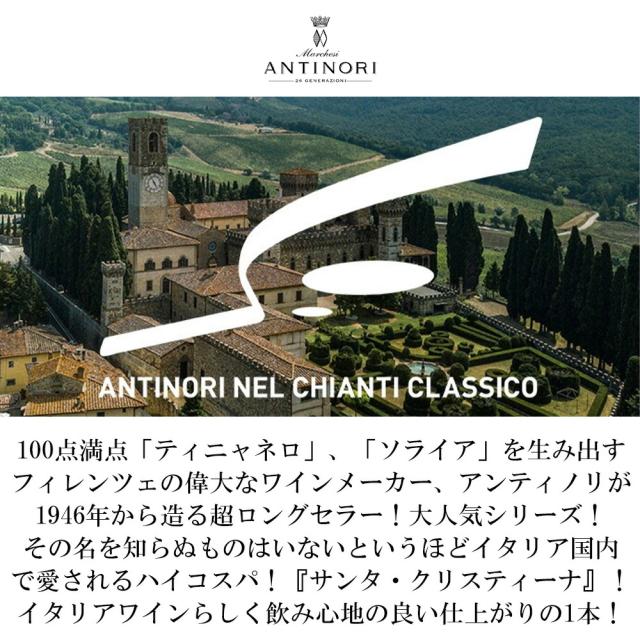 100点満点「ティニャネロ」、「ソライア」を生み出す フィレンツェの偉大なワインメーカー、アンティノリが 1946年から造る超ロングセラー!大人気シリーズ! その名を知らぬものはいないというほどイタリア国内 で愛されるハイコスパ!『サンタ・クリスティーナ』! イタリアワインらしく飲み心地の良い仕上がりの1本!