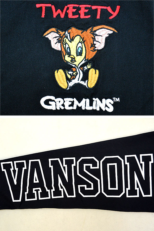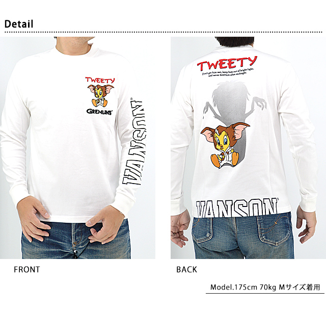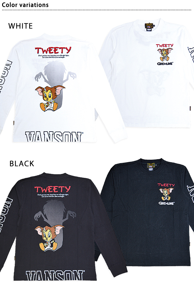 上質なレザーを使って生み出された数々のアイテムがバイカーに大人気のvansonから「vanson×LOONEY WARNER BROS.100周年記念モデル 天竺ロングTシャツ(LTV-2402)」のご紹介です。 アメリカのワーナーブラザーズが製作するアニメーション【LOONEY TUNES】の人気キャラクターをモチーフにしました! 今回のデザインの主役は、可愛らしい外見からは想像出来ない腹黒さを持つカナリアのキャラクター【トゥイーティー】です。 LOONEY TUNESを制作するワーナーブラザース社100周年を記念したスペシャルモデル! 今回は同社が映画配給を手掛けたSF映画「グレムリン」を合わせた、特別バージョンです。 背中にはグレムリンの着ぐるみを身に着けたトゥイーティーが刺繍で描かれています。 バックにしっかり柄を入れている分、フロントはシンプルに仕上げ、メリハリを付けました。 左袖にはブランドロゴをライン状にプリントしています。 ボディーには、綿100%の天竺Tシャツ生地を採用。 | |||||||||||||||||||||||||