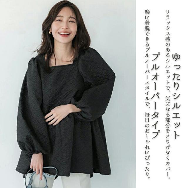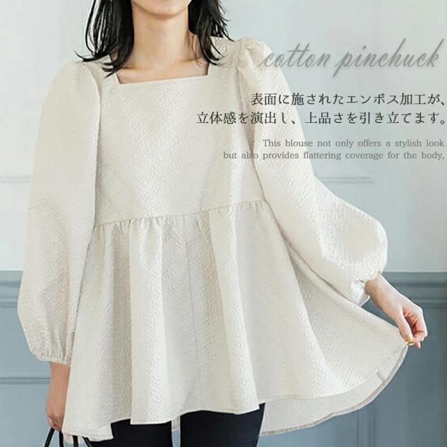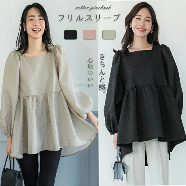 ブラウス レディース トップス プルオーバー フリルス 体型カバー パーカー トレーナー シャツ エンボス加工 スクエアネック パフスリーブ おしゃれ ゆったり【品番】