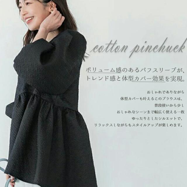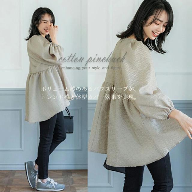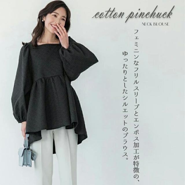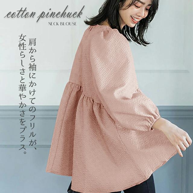 ブラウス レディース トップス プルオーバー フリルス 体型カバー パーカー トレーナー シャツ エンボス加工 スクエアネック パフスリーブ おしゃれ ゆったり