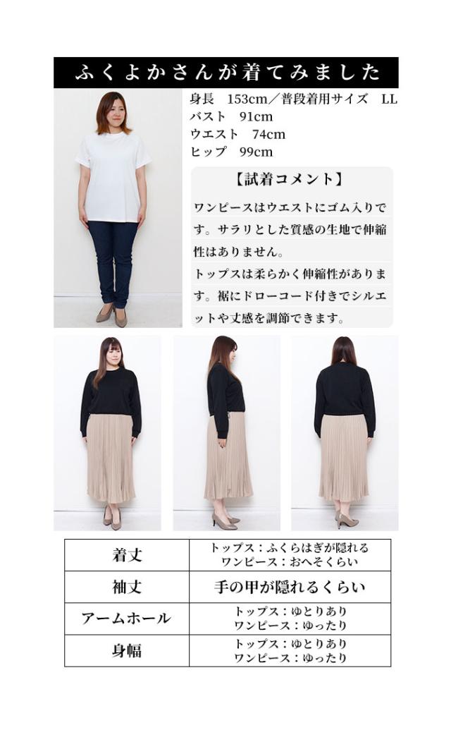 ワンピースの着丈は足首が見えるくらいです。首元はラウンドネックで脇グリは広いです。ウエストにゴムが入っていて伸縮性があり程よいフィット感で着用出来ました。裾に向かって少し広がるプリーツで体型を拾わず着用出来ました。滑らかな生地で肌触り良かったです。トップスの着丈は骨盤にかかるくらいです。袖は指先が見えるくらいです。脇グリも身幅も余裕があり楽に着用出来ました。裾にドローコードがついているので絞れるのも良いですね。伸縮性のある柔らかいカットソー生地で肌触り良かったです。