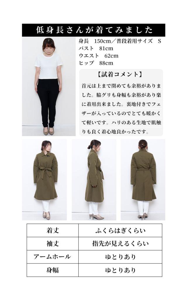 着丈はふくらはぎにかかるくらいです。首元は上まで閉めても余裕がありました。袖は伸ばすと指先が見えるくらいです。脇グリも身幅も余裕があり楽に着用出来ました。裏地付きでフェザーが入っているのでとても暖かくて軽いです。ハリのある生地で肌触りも良く着心地良かったです。
