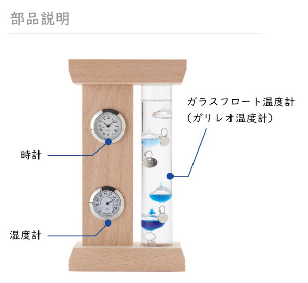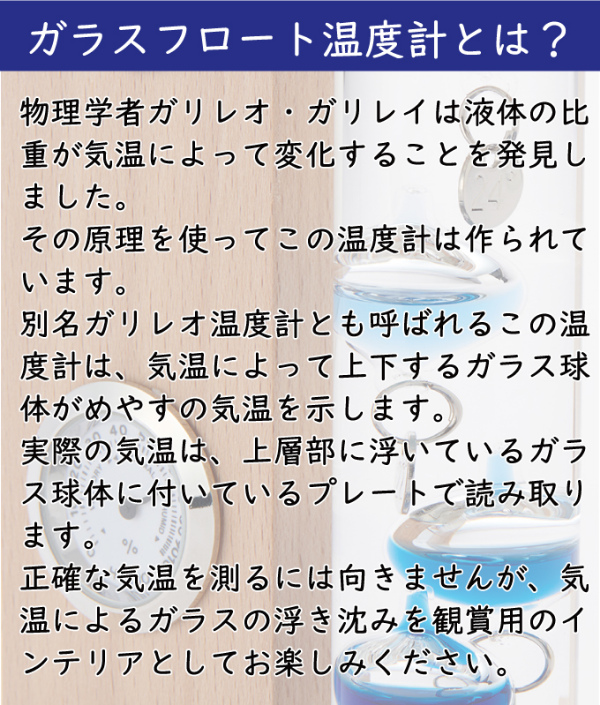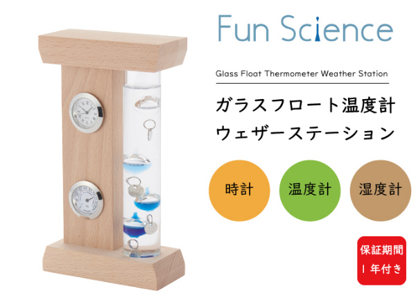 正確な気温を測るには向きませんが、オブジェとしてユニークなインテリア Fun Science(ファン・サイエンス)の温度計。おしゃれなガラスフロート温度計!ガラスフロート温度計と時計、湿度計がセットになったインテリアアイテムです。ブルー系のグラデーションの球体が目を引く人気のガラスフロート温度計(通称ガリレオ温度計)はお部屋のアクセントにもぴったり。物理学者のガリレオ・ガリレイは液体の比重が気温によって変化することを発見。その原理を使ってこの温度計は作られております。気温によって上下するガラスの球体が気温を示します。実際の気温は浮いてるガラス球体の一番数値の低いプレートを読み取ります。カラフルでポップ、そこに透明感や爽やかさも加わって、お部屋をぐっとオシャレに彩ってくれます。
