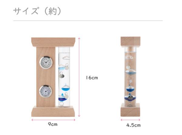 【商品サイズ(約)】9×4.5×16cm【商品重量(約)】230g【材質】ホウケイ酸ガラス、パラフィンオイル、天然木(ビーチ材)、他【商品仕様】■ボタン電池(酸化銀)1個付属■測定可能範囲:18〜24℃■ガラス球体4個【生産国】中国【メーカー】茶谷産業