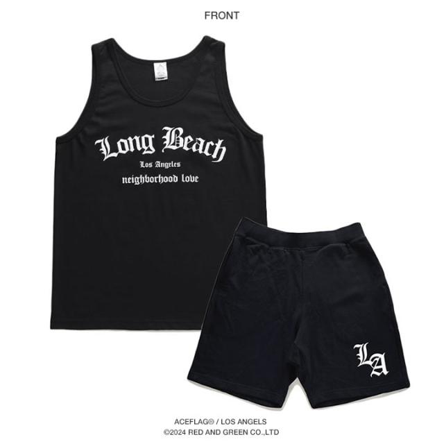 LBCの 略称で馴染み深い「Long Beach」をドロップしたタンクトップと「Los Angeles」の頭文字にあたる「LA」をワンポイントでドロップしたスウェットハーフパンツの上下セット。