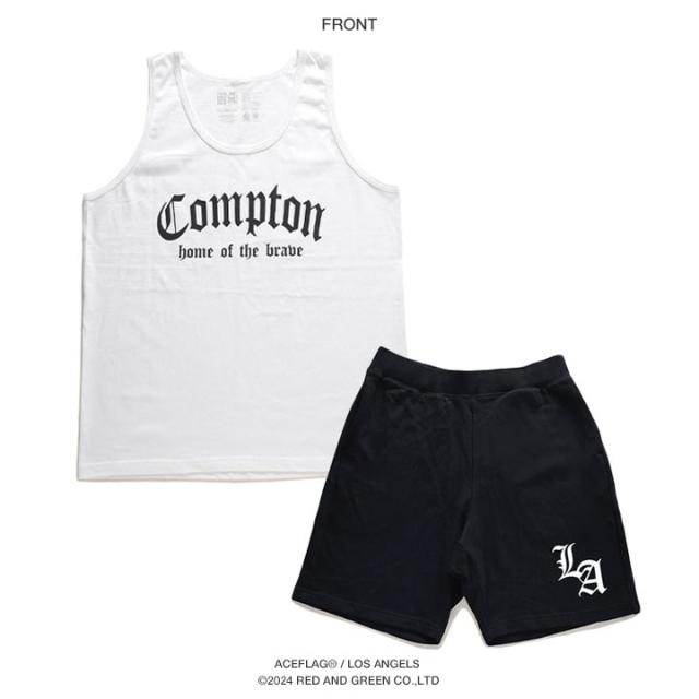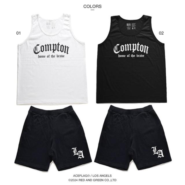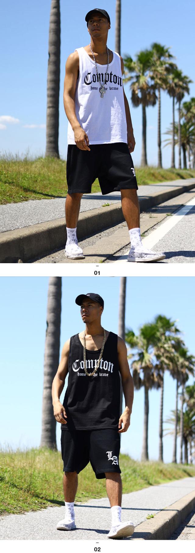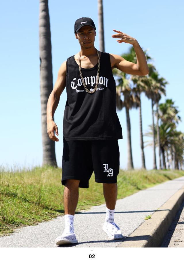 N.W.A.を輩出し、Straight Outta Comptonの舞台としても知られている「Compton」をドロップしたタンクトップと「Los Angeles」の頭文字にあたる「LA」をワンポイントでドロップしたスウェットハーフパンツの上下セット。