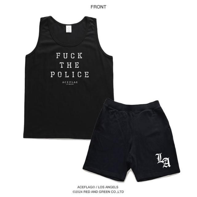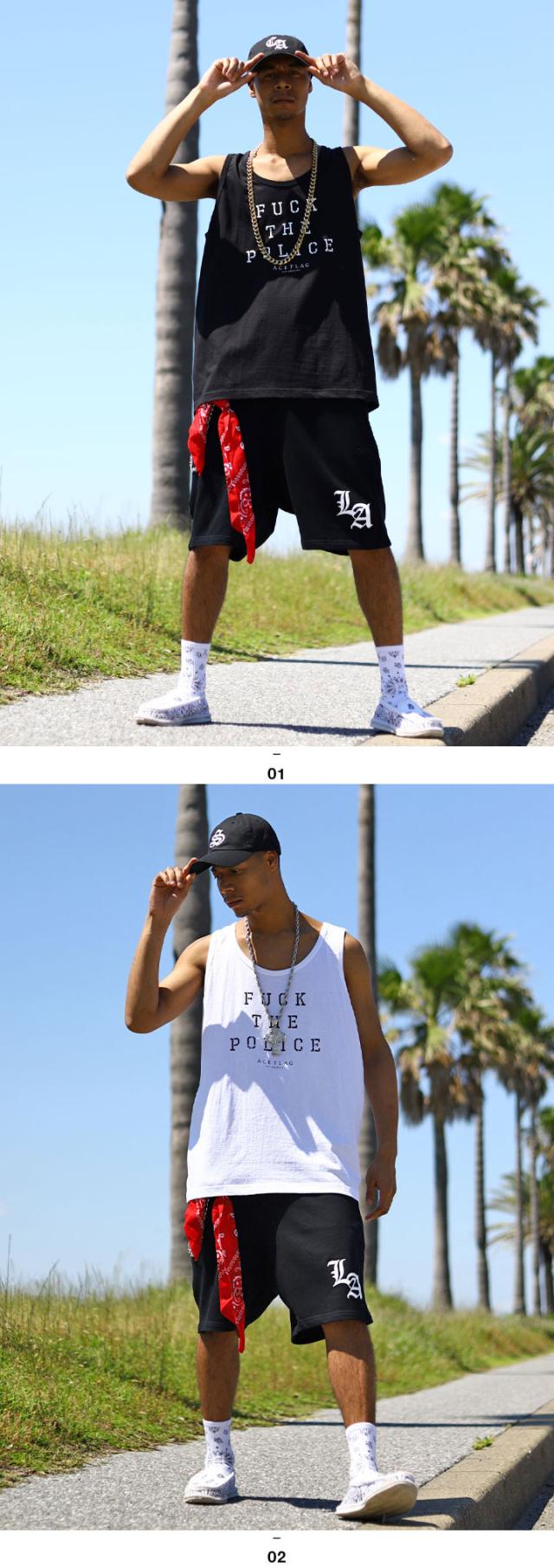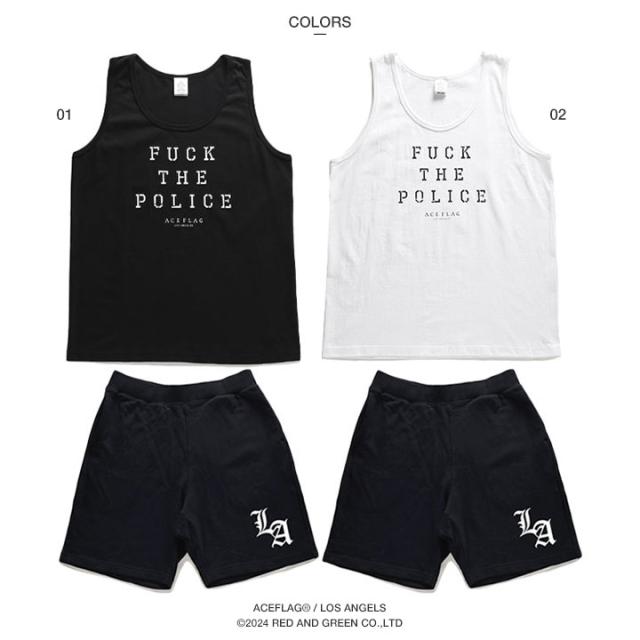 ACE FLAG 上下セット ブランド ノースリーブ Tシャツ タンクトップ ハーフパンツ メンズ 春夏用 黒 白 大きいサイズ エースフラッグ セットアップ Fuck the Police ファック・ザ・ポリス ビッグシルエット b系 ヒップホップ ストリート系 ハイ 新作 AF-SE-TK-037