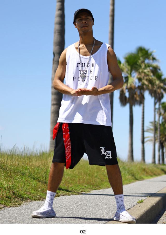 「Fuck the Police/ファック・ザ・ポリス」をドロップしたタンクトップと「Los Angeles」の頭文字にあたる「LA」をワンポイントでドロップしたスウェットハーフパンツの上下セット。