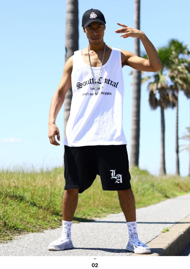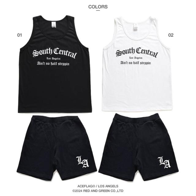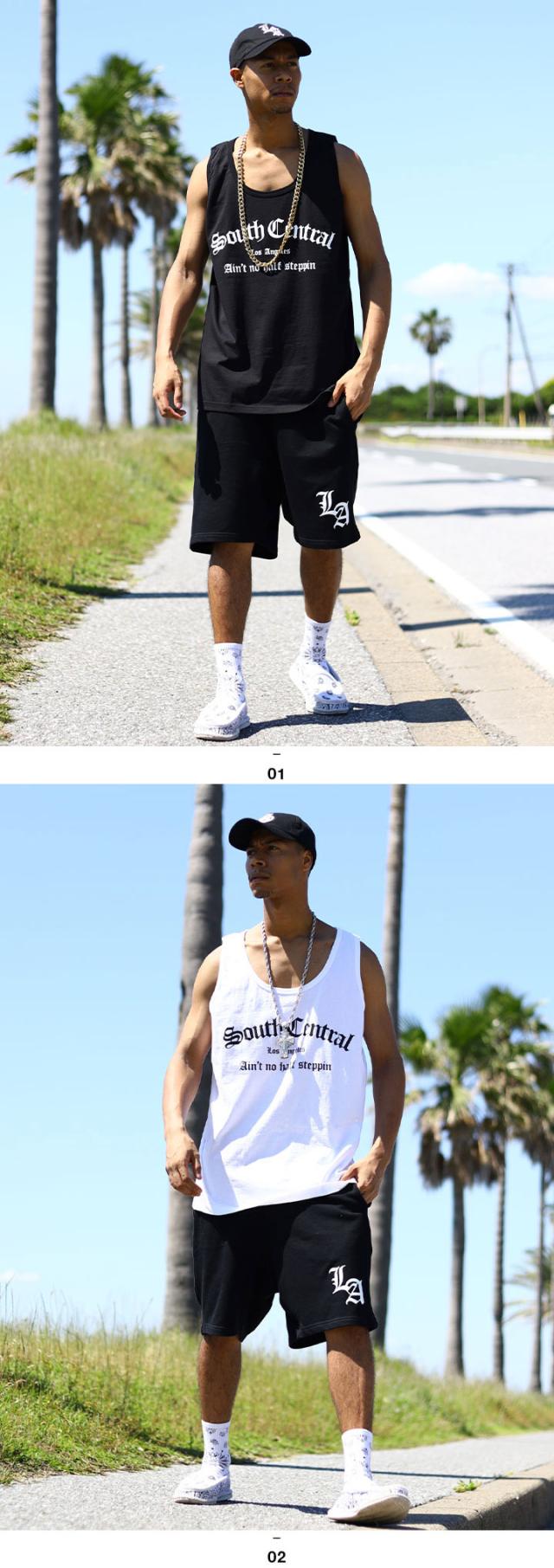 オールド文字で「South Central」をドロップしたタンクトップと「Los Angeles」の頭文字にあたる「LA」をワンポイントでドロップしたスウェットハーフパンツの上下セット。