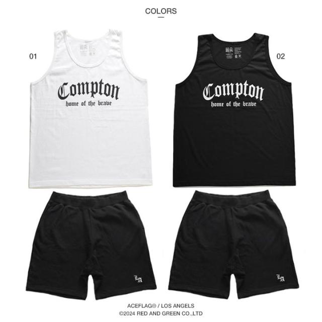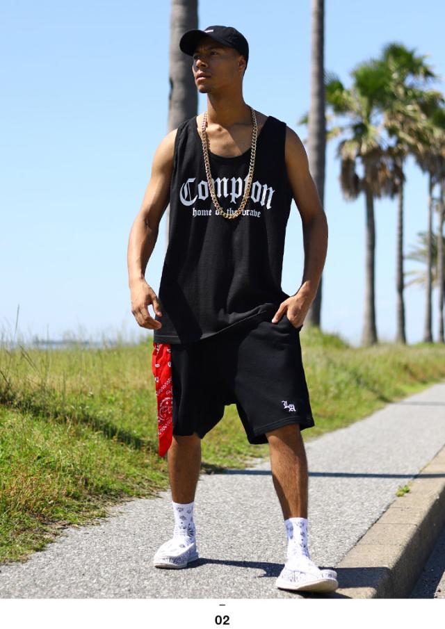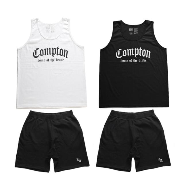 N.W.A.を輩出し、Straight Outta Comptonの舞台としても知られている「Compton」をドロップしたタンクトップとLos Angelesの頭文字にあたる「LA」のミニロゴ刺繍を施したスウェットハーフパンツの上下セット。