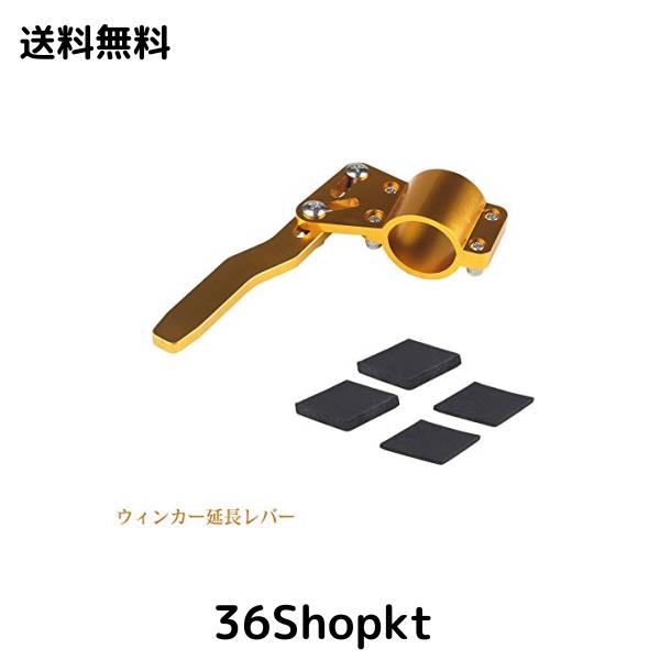 製品仕様: サイズ:全長・約125mm 高さ・約30mm 幅・約70mm カラー:ゴールド 材質:アルミニウム 重量:約100g 対応ウィンカーレバーサイズ:直径約18mm~28mm 調整可能範囲:約30mm~100mm