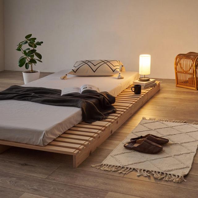 国産ひのきを使用した丈夫なパレットベッドです。天然木ならではの優しい風合いが、海外インテリアのようなラフな雰囲気を演出してくれます。ローベッドなので圧迫感が少なく、広々とした癒しの寝室になります。
