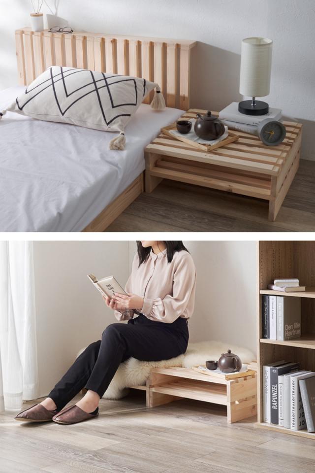 パレットを追加して気軽にベッド周りのアレンジも楽しめます。それぞれ2枚使用してヘッドボードやサイドテーブルに、4枚使用して一息つけるベンチにと自由に組み変えができます。ズレにくい設計なので、重ねても安心してお使いいただけます。