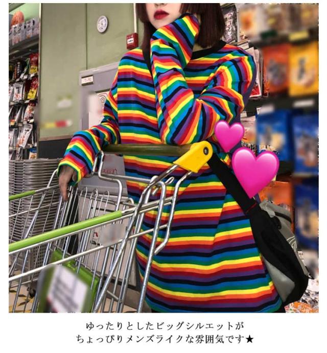 カットソー レインボー 長袖 カットソー Tシャツ マルチボーダー柄 ダンス 個性的 トップス ゆったり 衣装 ヒップホップ 韓国ファッション カラフル 服 原宿系 おしゃれ hiphop ストリート 体型カバー