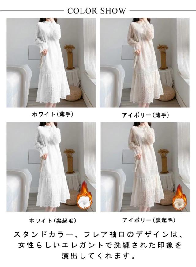 | レースのシアー感が上品で落ち着き感のあるワンピース。 スタンドカラー、フレア袖口のデザインは、女性らしいエレガントで洗練された印象を演出してくれます。 大人可愛い印象を上げる「アイボリー」とシックで飽きの来ない「ホワイト」からお選び頂けます。 1枚でコーディネートが完成♪少し寒い時期には上にジャケットが羽織りやすくて便利です♪ アクセサリーや時計等の小物を使えば更におしゃれ度がアップします。 | |